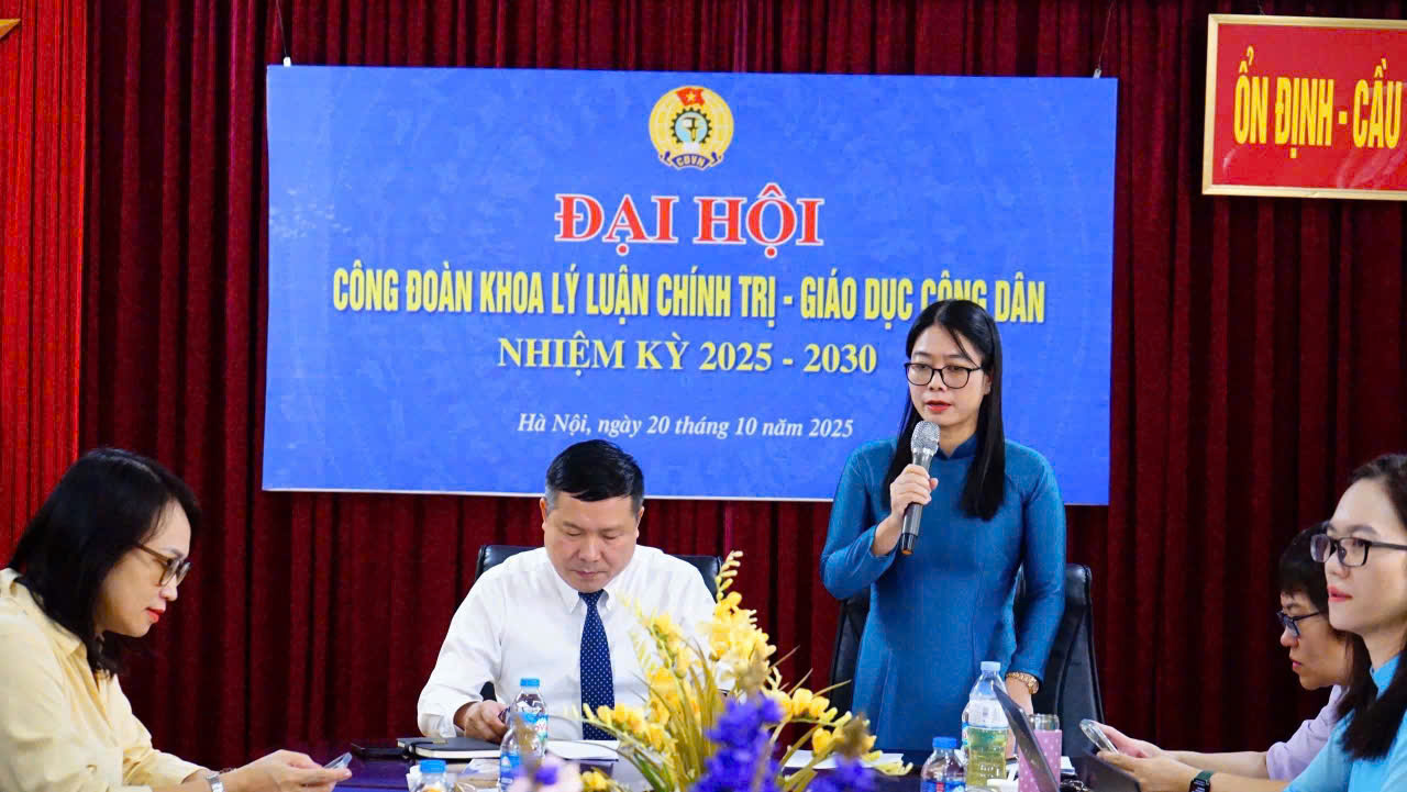 Tại Đại hội, PGS.TS Nguyễn Thị Thanh Tùng – Chủ tịch Công đoàn Khoa LLCT - GDCD đã trình bày báo cáo tổng kết công tác công đoàn nhiệm kỳ 2023 – 2025 và phương hướng công tác nhiệm kỳ 2025 – 2030. Trong đó, PGS.TS Nguyễn Thị Thanh Tùng nhấn mạnh kết quả hoạt động công đoàn nhiệm kỳ 2023 – 2025 trong công tác hành chính; công tác chăm lo, đại diện bảo vệ quyền, lợi ích hợp pháp chính đáng cho CBNGNLĐ; công tác tham gia quản lý, xây dựng mối quan hệ lao động hài hoà, ổn định; công tác tuyên truyền; công tác phát triển đoàn viên, xây dựng tổ chức công đoàn cơ sở vững mạnh, nâng cao chất lượng cán bộ công đoàn, chất lượng hoạt động công đoàn; công tác phát triển đoàn viên và tham gia xây dựng Đảng. Những kết quả đạt được cho thấy sự nỗ lực của BCH Công đoàn Khoa trong hoạt động chăm lo đời sống vật chất, tinh thần cho ĐVCĐ, xây dựng khối đoàn kết của đơn vị, bảo vệ quyền và lợi ích chính đáng cho người lao động. Dựa trên những kết quả hoạt động trên, báo cáo cũng chỉ ra mục tiêu, nhiệm vụ và các giải pháp cụ thể cho nhiệm kỳ 2025 – 2030. Đại hội cũng lắng nghe TS. Phan Thị Lệ Dung trình bày bản thảo luận và góp ý về hình thức, bố cục và nội dung dự thảo Báo cáo của Ban chấp hành Công đoàn Trường khóa XVIII tại Đại hội lần thứ XIX, nhiệm kỳ 2025 – 2030. Các công đoàn viên Khoa LLCT – GDCD tích cực trao đổi, thảo luận để đóng góp ý kiến cho hoạt động của công đoàn Khoa và công đoàn Trường.