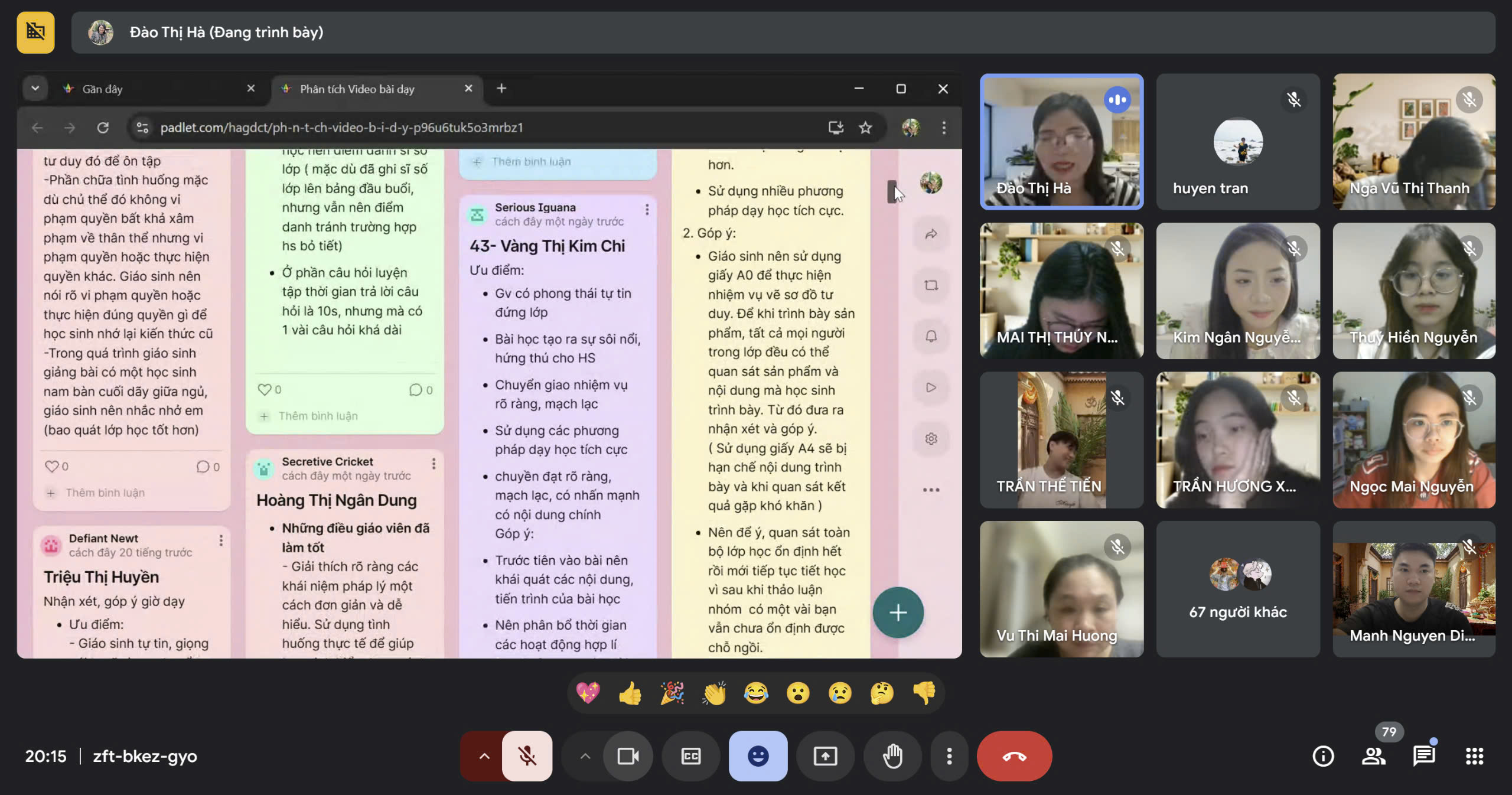 Video giảng dạy của em Nguyễn Thị Kim Ngân nhận được nhiều phản hồi tích cực của Thầy Cô và các bạn sinh viên về tác phong giảng dạy tự tin, chuẩn mực; cách xử lý tình huống sư phạm khéo léo; việc triển khai các hoạt động học tập thu hút được sự tham gia, hưởng ứng tích cực của học sinh. Bên cạnh đó, thầy cô và các bạn sinh viên cũng tích cực góp ý để việc tổ chức dạy học được hoàn thiện hơn ở các khía cạnh như: chuyển giao nhiệm vụ học tập; phương thức tổ chức các hoạt động học tập; cách thức trao đổi, tương tác, khái quát các kiến thức, kĩ năng mới trong dạy học môn Giáo dục kinh tế và pháp luật. Không những thế, trong buổi sinh hoạt, các Thầy Cô cũng chia sẻ với các bạn sinh viên những bài học kinh nghiệm để tổ chức, triển khai dạy học môn Giáo dục kinh tế và pháp luật hiệu quả hơn ở trường phổ thông.